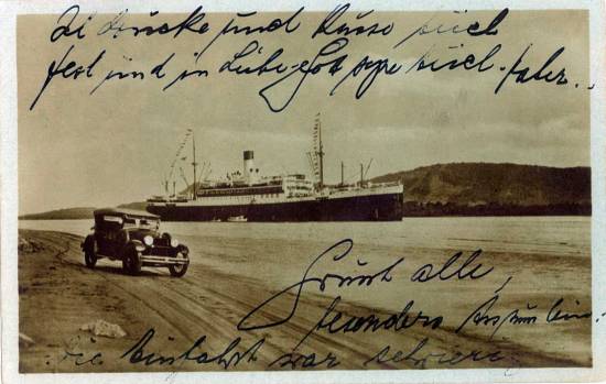 O Cap Norte, passando pela Ponta da Praia, em Santos, por volta de 1928 em cartão postal com texto manuscrito em alemão. A embarcação era gêmea do navio