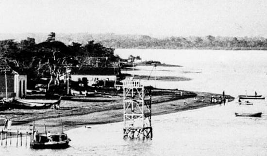 Esta imagem, de cartão postal aproximadamente da mesma época, mostra o futuro bairro do Estuário visto desde a Ponta da Praia, antes da efetiva ocupação pelo avanço do porto e  conseqüente urbanização - uma época em que predominavam na paisagem apenas as casas de pescadores. Uma torre (gêmea de outra existente no território insular santista) suportava os fios de alta tensão que transpõem o estuário do porto, com a eletricidade gerada na usina de Itatinga para o cais santista: