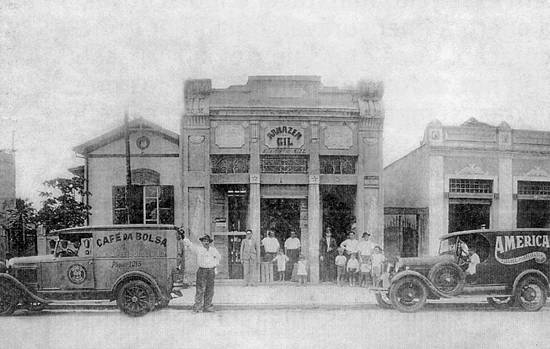 Nesta imagem de 1934, um dos antigos armazéns de bairro (não mais existente), com veículos de entrega de mercadorias, que se situava na Rua Carvalho de Mendonça, 361: o Armazém Gil. Na porta do estabelecimento, familiares do proprietário, inclusive Neide Gil Pereira (então com cinco anos de idade, de vestido), a quem pertence a imagem (publicada na seção Imagem do Passado do jornal santista A Tribuna, em 5/12/2003):
