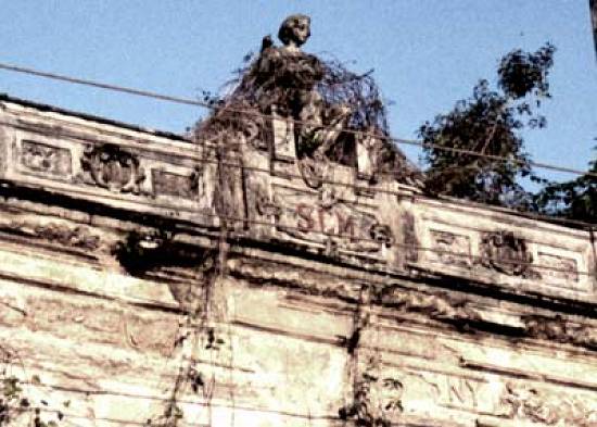 Detalhe da fachada deteriorada do teatro em fins do século XX, vendo-se a inscrição
