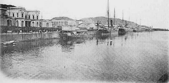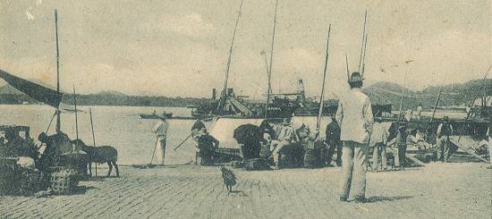 Na ampliação parcial dessa imagem via-se o cais do porto, então já pavimentado na região próxima à Praça da República, mas por onde transitavam livremente galinhas, cães, vendedores
