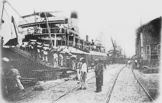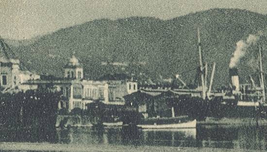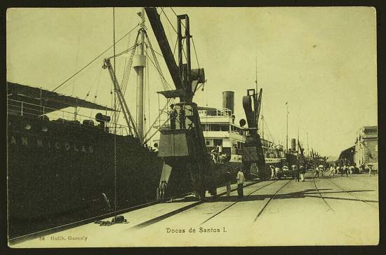 O porto, com a movimentação de cargas junto ao cargueiro San Nicolas, foi registrado pelo fotógrafo Guilherme Gaensly, para este cartão postal agora preservado na capital paulista pela