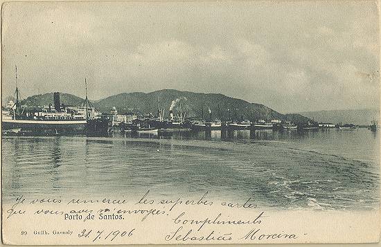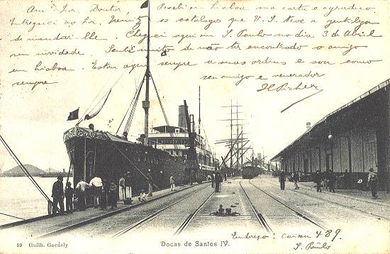 Em 20 de junho de 1906, passava por Lisboa, em caminho para Oeiras (Portugal), este cartão postal com foto também de Guilherme Gaensly, mostrando o vapor La Plata atracado em Santos, e