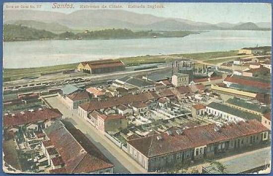 Este raro cartão postal do início do século XX, colorizado à mão, mostra o trecho inicial do porto, no "extremo da cidade" de Santos, com as instalações da ferrovia São Paulo