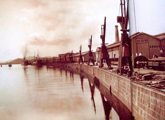 Trecho do cais recém-construído e os guindastes, em 1902: