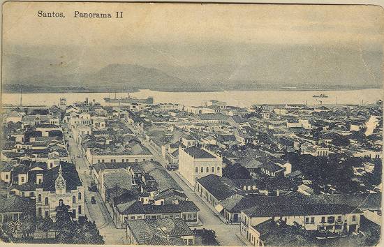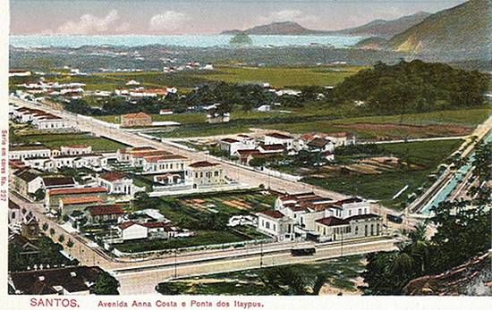O postal abaixo foi produzido alguns anos depois, como se observa pela evolução das construções da Vila Mathias. Note-se ainda o surgimento da arborização no centro da Avenida Ana Costa, vista (desde a encosta do Monte Serrat) na confluência com a Av. Rangel Pestana e a recém-aberta Avenida Pinheiro Machado e seu canal 1: