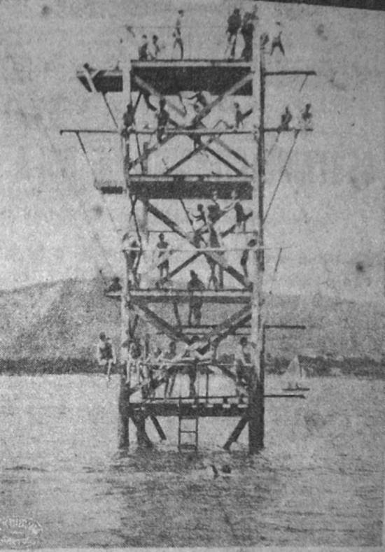 À hora em que lá estivemos, mais de 30 nadadores e saltadores, como se pode ver pela gravura, faziam da torre de saltos, quase que inteiramente reformada, o seu alegre "pombal"...