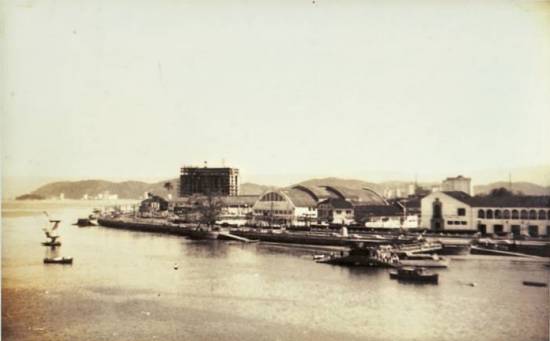 Esta fotografia, medindo 13,5 x 8,5 cm, mostra a Ponta da Praia por volta de 1950, com o trampolim no mar, à esquerda: