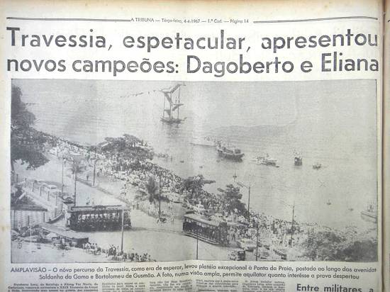 O trampolim é visto ainda na foto publicada em 4 de abril de 1967, na página 14 do 1º caderno do jornal santista A Tribuna, junto com matéria sobre a XXIX Travessia do Canal a