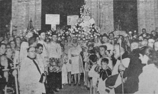 Retorno das imagens de N. S. da Aparecida à Catedral - Grande foi a massa de povo que, à noite, compareceu à Praça José Bonifácio. Esperava aquela multidão o retorno das imagens de N. S. da Aparecida que, durante três meses, estiveram em visita às paróquias de Cubatão, S. Vicente e Guarujá, além das de Santos, em preparativo do Congresso. Essas imagens se encontravam nas paróquias de Santo Antônio do Valongo, Imaculado Coração de Maria e Vila Macuco.