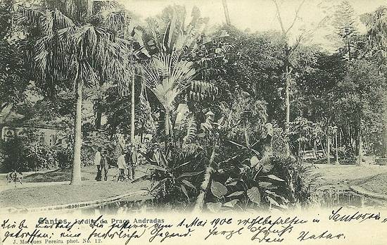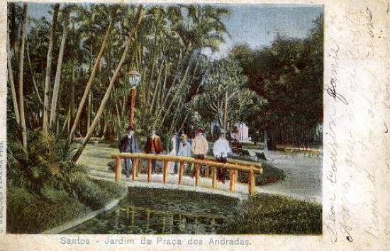 | Os jardins da Praça dos Andradas, em raro cartão-postal de 1898, postado no dia 8 de fevereiro de 1900 e endereçado a uma cidade do