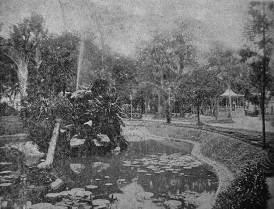 Pereira e foi colorizada à mão. Mostra um antigo recanto dessa praça, com lago e pessoas em uma ponte que mais tarde seria transferida para o Orquidário, onde está até hoje: