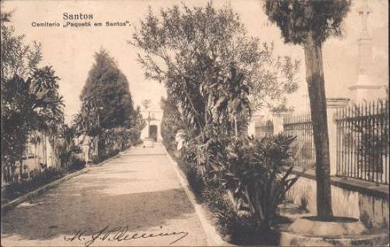 Santos já teve época em que até os seus cemitérios eram motivo de orgulho e se transformavam em cartão-postal. Este, de 1906, com foto  de H. Eckmann, mostra o Cemitério do Paquetá, onde estão enterrados vários santistas ilustres. Veja-se os jardins bem cuidados...: