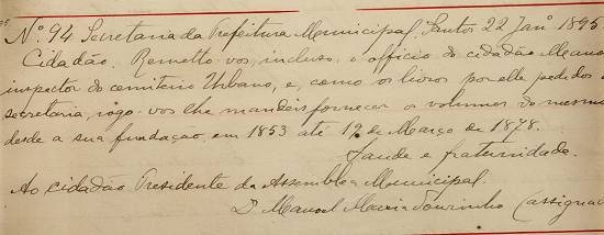 Em seu diário, onde registrava as atividades à frente do Executivo Municipal, o ex-prefeito (então chamado de intendente) Manoel Tourinho registrava, em 22 de janeiro de 1895: "Cidadão: Remeto-vos, incluso, o ofício do cidadão Manoel, inspetor do cemitério Urbano, e como os livros por ele pedidos à secretaria, rogo-vos lhe mandeis fornecer os volumes do mesmo desde a sua fundação em 1853 até 19 de março de 1898. Saúde e fraternidade. Ao cidadão Presidente da Assembléia Municipal":