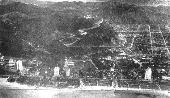 Nesta foto aérea publicada em 1954, tendo em primeiro plano a praia e o bairro do José Menino, são vistos alguns dos primeiros edifícios da orla, e bem ao centro as instalações do Orquidário Municipal (em formação), do Parque das Águas (instalações da rede urbana de águas e esgotos), e do Clube dos Ingleses. No único trecho ocupado por imóvel na faixa de areia e jardins, o antigo Hotel Internacional. Dominando a paisagem, o Monte Santa Therezinha e o Morro do José Menino, e à direita uma parte do bairro do Marapé: