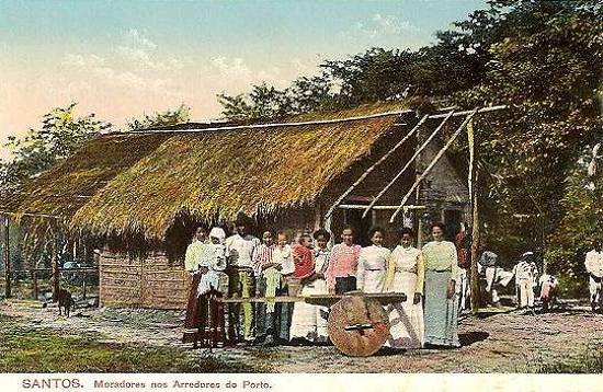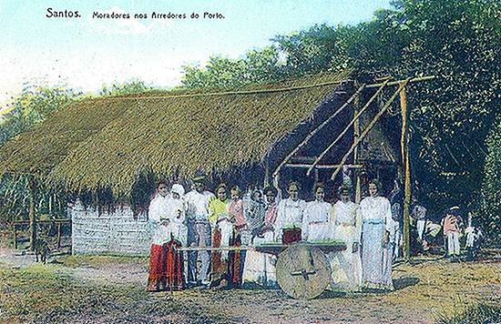 Parece uma choupana perdida na clareira de alguma floresta, mas é uma imagem de Santos insular, possivelmente obtida no bairro do Estuário ou Macuco, em área bem próxima ao porto santista, que ali começava a chegar em seu avanço rumo à Ponta da Praia.