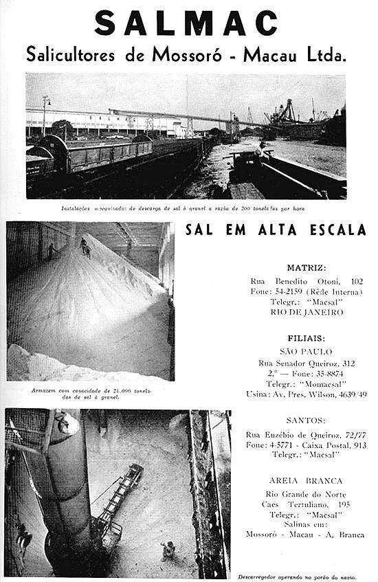 Digamos, porém, algumas palavras sobre a notável empresa. É a Salmac uma companhia que se constituiu para produzir e vender o sal em alta escala. Suas grandes salinas se encontram em Areia Branca, Macau e Mossoró, no Estado do Rio Grande do Norte, e sua capacidade de produção é superior a 140.000 toneladas por ano, e movimenta uma tonelagem que representa 23,60% da quota total do Rio Grande do Norte, 19,94% do consumo total do país, no qüinqüênio 1945/49.