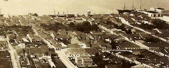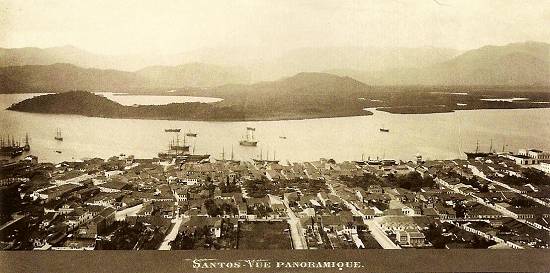 | Com seus barcos a vela no Estuário, Santos em 1880 era ainda uma cidade confinada essencialmente ao seu atual centro histórico, como se verifica nesta vista