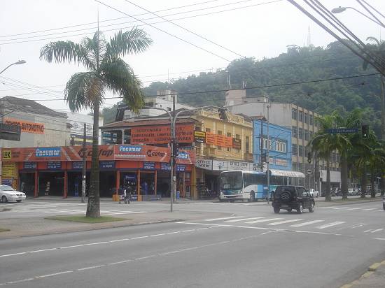 Mais meio século passado, desde a publicação da matéria acima, e esta é a vista atual daquele cruzamento, da Avenida Ana Costa com a Rua Lucas Fortunato, tendo ao fundo o Monte Serrat. Apenas o casarão reformado em 1928 se manteve, com poucas alterações. No lugar dos trilhos e fiação elétrica para os bondes, resta apenas a linha energizada para o serviço de trólebus, que também se tenta extinguir: