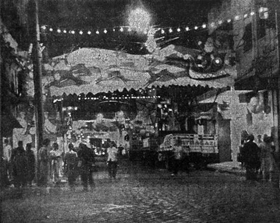 FEÉRICA A RUA JOÃO PESSOA - Comerciantes da Rua João Pessoa, no trecho compreendido entre as ruas Martim Afonso e Senador Feijó, realizaram um movimento a fim de embelezar e i luminar aquela via pública para os festejos natalinos. Essa conjugação de esforços, com o auxílio da Prefeitura, do SMTC e da Cia. City, redundou em vistosa ornamentação, dando novo colorido àquele trecho da cidade, aliás o mais feérico. Além da iluminação pública, os comerciantes melhoraram, também, sensivelmente, a iluminação de seus estabelecimentos, inclusive as vitrinas.