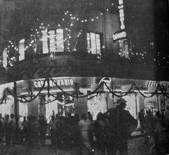 ORNAMENTAÇÃO DA CASA DO RÁDIO - Colaborando com as autoridades municipais, os diretores da Casa do Rádio, situada na esquina das ruas Amador Bueno e D. Pedro II, no sentido de ornamentar a fachada do estabelecimento, bem como melhorar a iluminação pública, traçaram e determinaram a execução de um plano de decoração especial, com motivos natalinos. Grande quantidade de lâmpadas foi empregada e a farta distribuição de luzes veio dar uma feição diferente àquele local. A Casa do Rádio contratou também uma banda que percorreu o centro, executando músicas natalinas.
