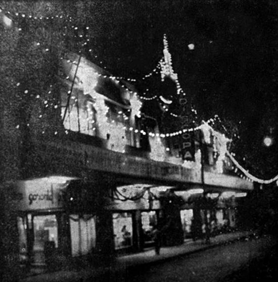 O NATAL E A DISCOPA - Como tantos outros estabelecimentos, a firma Discopa, à Rua S. Francisco, enfeitou e iluminou não só a fachada do prédio onde funciona como, também, a parte interior. A feérica iluminação da Discopa veio trazer à Rua São Francisco, trecho compreendido entre a Rua Frei Gaspar e Praça dos Andradas, maior encantamento, de vez que as milhares de lâmpadas foram dispostas com arte e gosto, conforme se observa no clichê acima. É a colaboração da Discopa com o poder público, nesta época em que se comemora o nascimento de Jesus Cristo