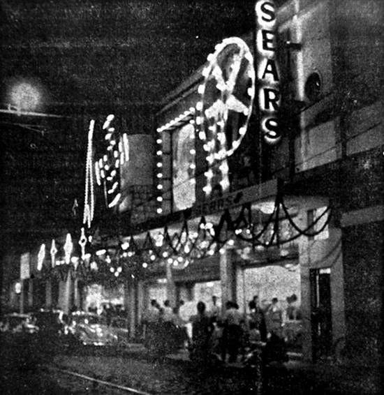 NATAL NA SEARS - Santos este ano está apresentando ambiente mais festivo para o período natalino. Cooperando com o poder público, o comércio não tem poupado esforços, ornamentando fachadas e vitrinas. A Sears esmerou-se também este ano. Tanto a fachada do prédio como a parte interior do estabelecimento apresentam-se feericamente iluminados. Arte e bom gosto combinam-se, dando maior beleza e imponência ao prédio onde funciona a Sears, conforme se pode verificar pelo clichê acima