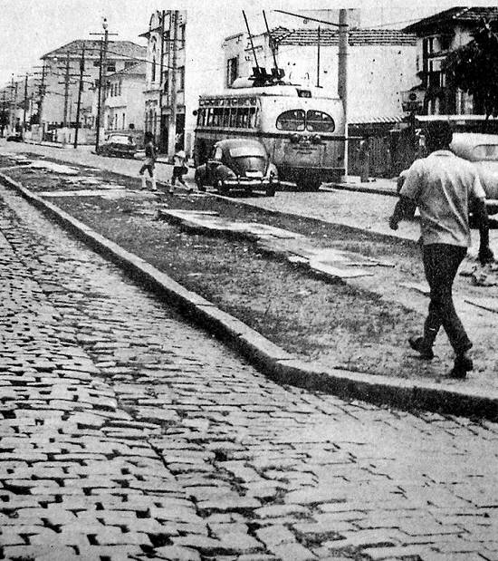 Nesta imagem, um trólebus da linha 8 passa (no Macuco) pela avenida,  que ainda conserva os antigos trilhos de bondes, recém-desativados, e o canteiro central em situação precária: