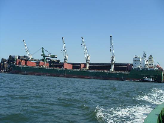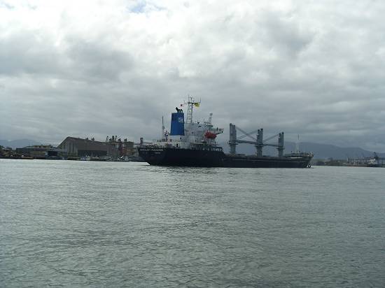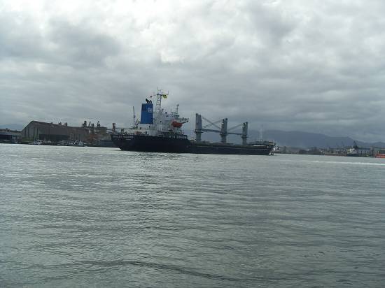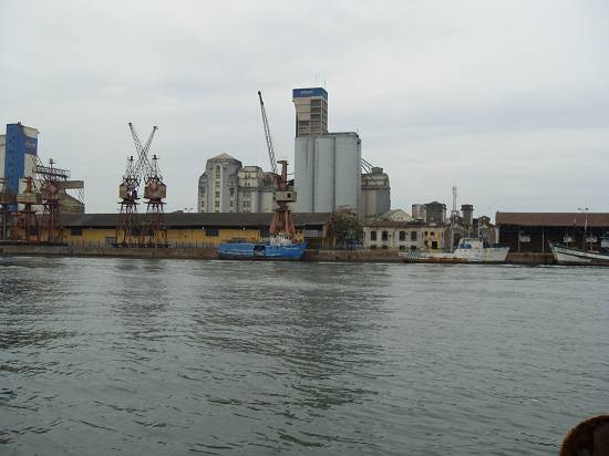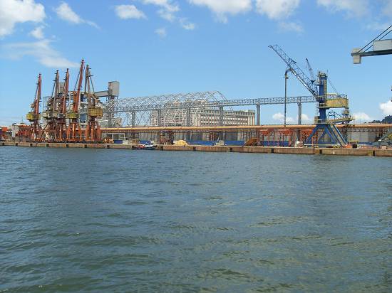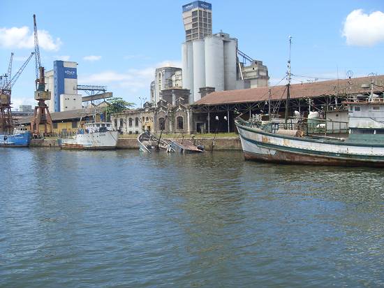 Perto do armazém 8, com o moinho da Bunge, o barco Orion e embarcação semi-submersa