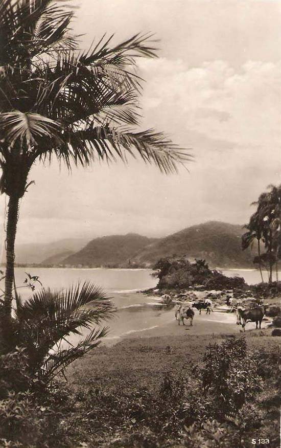 sobre "canoas nativas", casebres, de uma bucólica região praiana e de morros, sempre identificada como Santos: