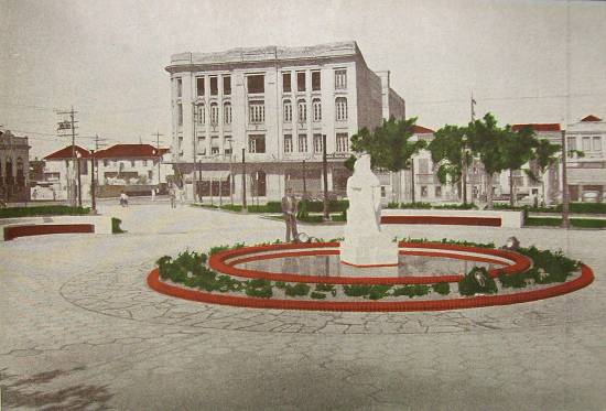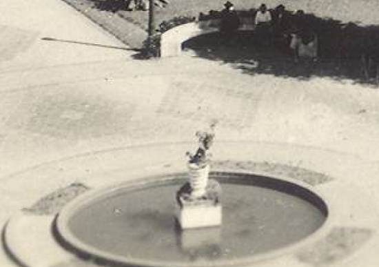 Na praça, a fonte recebeu por algum tempo um outro adorno, visto neste cartão postal da década de 1940, em foto obtida desde a torre da