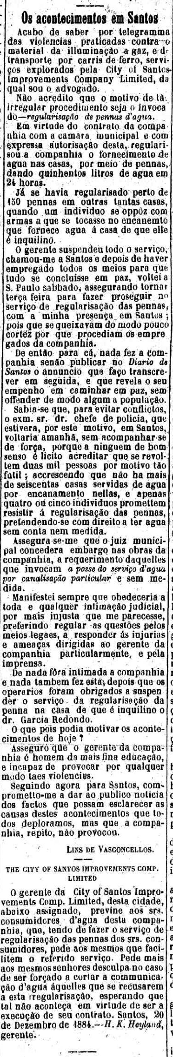 esta regularização, esperando que tal não aconteça em virtude de ser a execução de seu contrato. Santos, 20 de dezembro de 1884 - H. K. Heyland,