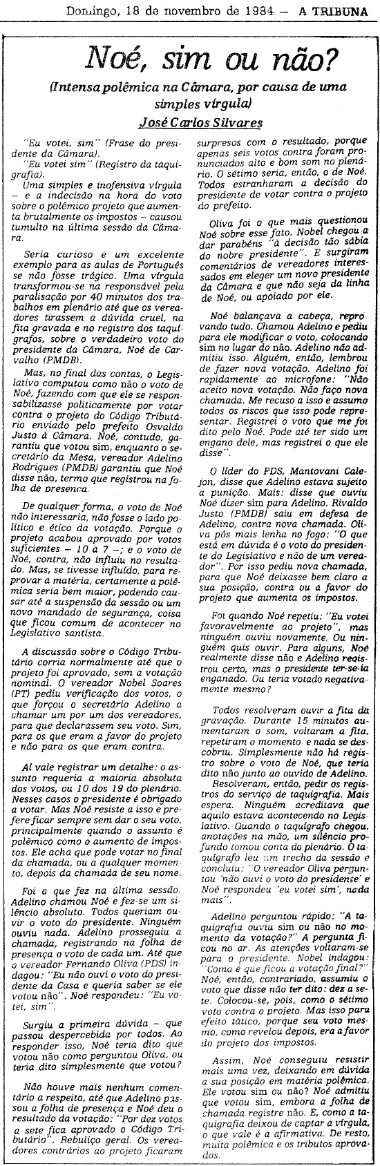 em matéria na edição de 18/11/1984 (página 4) do jornal A Tribuna:
