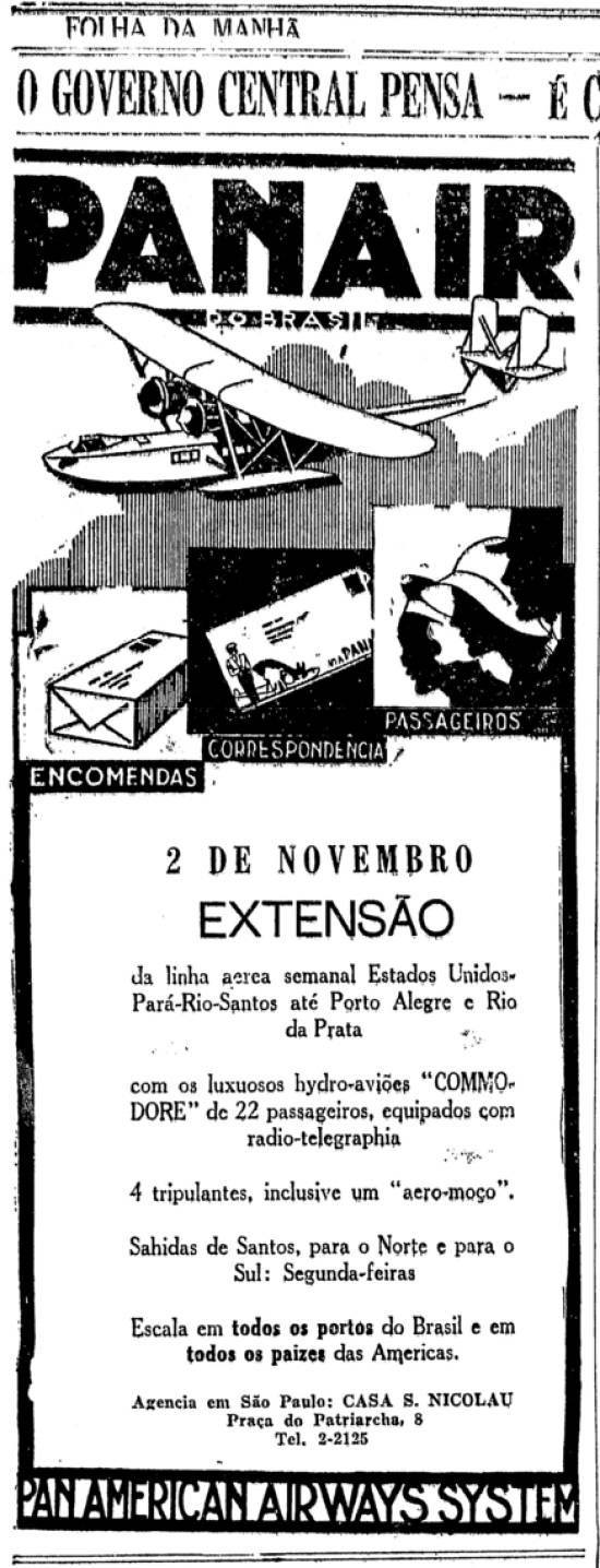 PanAir do Brasil estende sua linha de Santos até Buenos Aires Anúncio publicado no jornal paulistano Folha da Manhã de 30 de outubro de 1931 - página 5