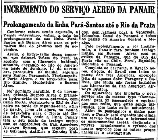 No domingo seguinte 8 de novembro, deixará Buenos Aires o primeiro hidroavião da nova extensão, com rumo Norte, alcançando o Rio de Janeiro na tarde de segunda-feira, a fim de partir, como até agora, na manhã de terça-feira para o Norte até Belém do Pará, onde a linha Panair tem o seu ponto de tráfego mútuo com os aparelhos da Pan American Airways System, que seguem para as Guianas, Antilhas e Estados Unidos, com ramais para a Venezuela, Colômbia, Canal do Panamá e todos os países da América Central e México.
