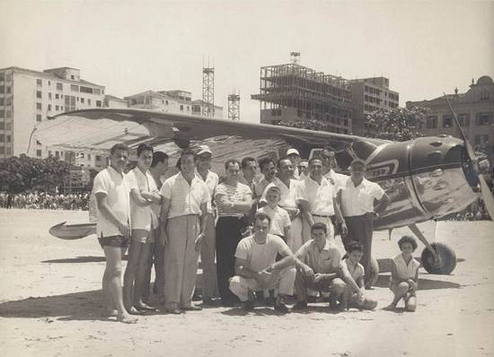 praia do Gonzaga, em 25/19/1959, posam para a foto, entre outros membros do Aero Clube de Santos, os pilotos Nelson Carvalho e Antonio Barros