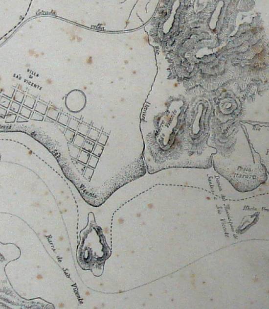 Esta planta de 1895 mostra o Rio Itararé, entre o então morro de São Vicente e a