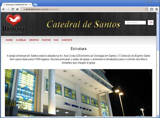 Estrutura - A Igreja Universal em Santos está localizada na Av. Ana Costa 329 próximo ao Gonzaga em Santos. O Cenáculo do Espírito Santo tem capacidade para 3.500 lugares. Na nave principal, o salão da igreja, o ambiente é climatizado para o conforto dos fiéis e visitantes que chegam à igreja.