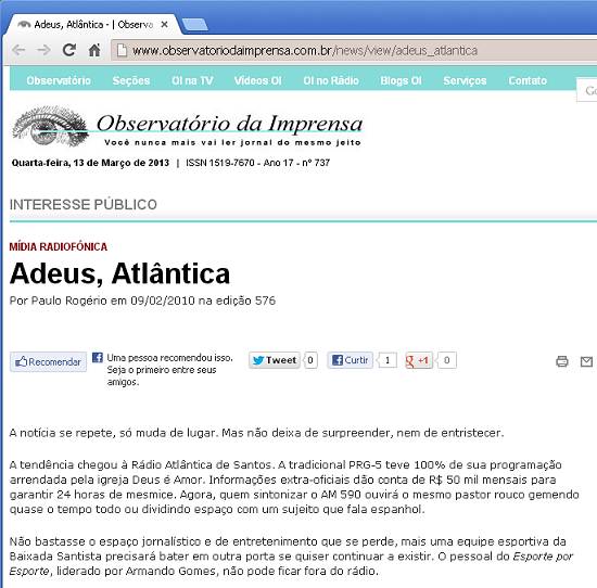 A tendência chegou à Rádio Atlântica de Santos. A tradicional PRG-5 teve 100% de sua programação arrendada pela igreja Deus é Amor. Informações