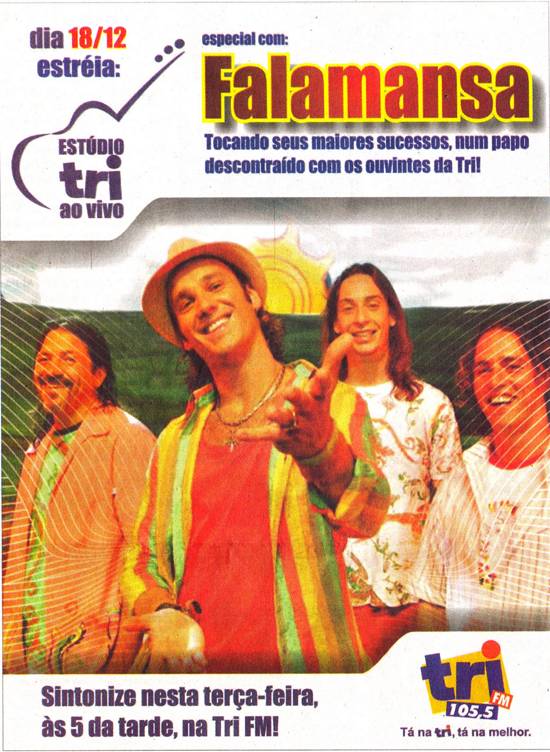 NO AR - O forró universitário do grupo Falamansa marcou ontem a inauguração dos modernos Estúdios Roberto Mário Santini, da Tri FM. O evento, ao vivo, contou também com a participação dos ouvintes