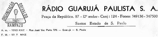 "Rampazzo disse ao Caio que enfrentou resistências na família, que considera um 'verdadeiro elefante branco' a aposta nas ondas curtas. Entretanto, tem convicção de que 'se por um lado não tem retorno financeiro, a onda curta engrandece a emissora'. Acrescenta que 'defende a ocupação do dial por emissoras nacionais, que é algo importante do ponto de vista cultural'. E o dexismo? Bom, Orivaldo Rampazzo disse que é 'um coruja'. Segundo o Caio, 'ele realmente sabe o dial dos 90 e 60 metros de cor e salteado!' De quebra, convidou o Caio para visitar a emissora e prosseguir o intercâmbio com o DX Clube do Brasil. E depois de tão boas notícias, o Caio não poderia deixar de pedir o endereço da emissora, onde os informes de sintonia dos ouvintes serão recebidos. É o seguinte: Rádio Guarujá Paulista, A/C Orivaldo Rampazzo, Rua Montenegro, 196, CEP: 11410-040, Guarujá (SP). Parabéns, Caio Fernandes Lopes, em mais um trabalho voluntário em prol do dexismo! DX Clube do Brasil, tradição em dexismo! (Célio Romais, August 12, ibid., WORLD OF RADIO 1195, DXLD)".