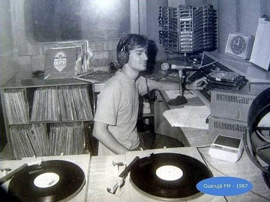 Emílio Sérgio Pechini, na cabine de locução da Rádio Guarujá FM em 1987: "com direito a pick-ups e um generoso ventilador de mesa" Foto divulgada por Emílio Sérgio Pechini em sua página Web no site Orkut, acesso em 2/8/2006