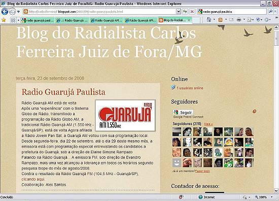 Blog do radialista Carlos Ferreira, de Juiz de Fora/MG, comenta em 23/9/2008 o retorno da Rádio Guarujá Paulista: "Rádio Guarujá AM está de volta. Após uma experiência com o Sistema Globo de Rádio, transmitindo a programação da Rádio Globo AM, a tradicional Rádio Guarujá AM (1.550 kHz - Guarujá/SP) está de volta. Agora afiliada à Rádio Jovem Pan Sat, a Guarujá AM voltou com sua programação local. Desde segunda-feira, dia 22 de setembro, até o dia 29 deste mesmo mês, a emissora está com programação especial entrevistando os candidatos à prefeitura do Guarujá, sob a direção de Elaine Simone Rampazo. Falando na Rádio Guarujá... A emissora FM, sob direção de Evandro Rampazo, mais uma vez alcançou a liderança em todos os horários segundo pesquisa Ibope do mês de agosto 2008 (...) - Colaboração: Alex Santos"