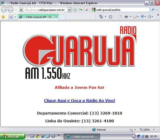 Trecho de transmissão da Rádio Guarujá FM (prefixo ZYD-815, em 104,5 MHz, concessão para Santos/SP), em 16 de julho de 2010 (de 0h04 a 0h10) - arquivo de som MP3, com 2'56", 64 kbps, estéreo, 22 kHz, 1,35 MB).