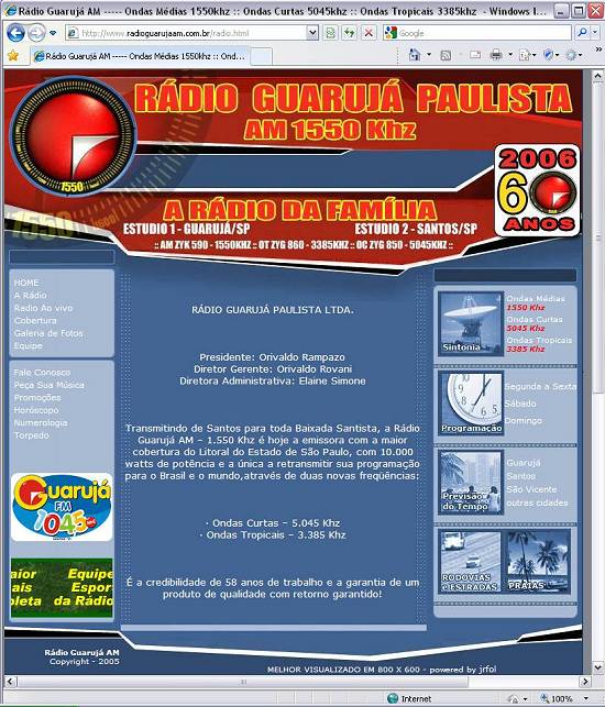 "Guarujá Paulista ou Clube, de Marília (SP), está emitindo em 3235 kHz, em 90 metros? Caio Fernandes Lopes, de Itajubá (MG), que é natural de Santos (SP), de onde emite a Guarujá, foi à luta, em busca de detalhes! Entrou em contato, via telefone, com a direção da Guarujá e --- bingo! A Rádio Guarujá Paulista adquiriu o transmissor da Rádio Clube, de Marília (SP). Os programas são enviados até Marília (SP), pela Internet. O diretor da Guarujá, Orivaldo Rampazzo, adiantou também que, na próxima semana, a emissora será captada pela frequência de 5.045 kHz, que era da Rádio Difusora, de Presidente Prudente (SP). O sinal sairá de Presidente. Por fim, uma engenheira foi contratada para trabalhar a viabilidade técnica da futura frequência na faixa de 31 metros, que já foi pedida junto à Anatel.