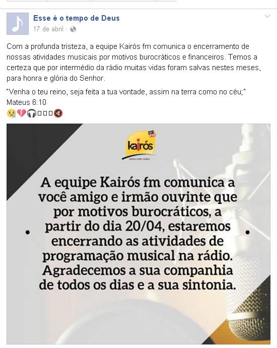 Imagem: comunicado de encerramento das atividades em página na rede social Facebook, em 20 de abril de 2017 (acesso: 21/5/2017) |