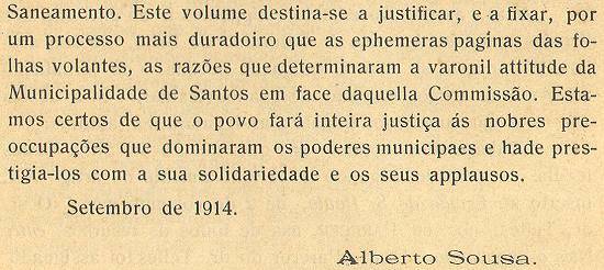 Este volume destina-se a justificar, e a fixar, por um processo mais duradouro que as efêmeras páginas das folhas volantes, as razões que determinaram a varonil atitude da Municipalidade de Santos em face daquela Comissão.