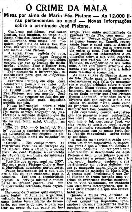 dinheiro, para referir-nos à suposição corrente nos meios policiais de que Maria Féa Mercedes foi assassinada por causa de 3.000 liras que