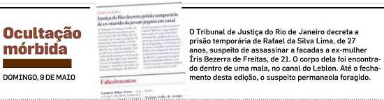 depois dizer que a culpa de tamanha mágoa era da dor que a consumia. Rafael é o principal suspeito de ter matado Íris a facadas, colocado a moça de