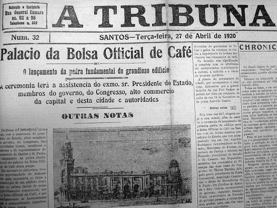 O prédio da Bolsa de Café de Santos teve seu projeto divulgado para o público em 1920, como noticiou o jornal santista A Tribuna, em 27 de abril de 1920 (ortografia atualizada nesta transcrição):